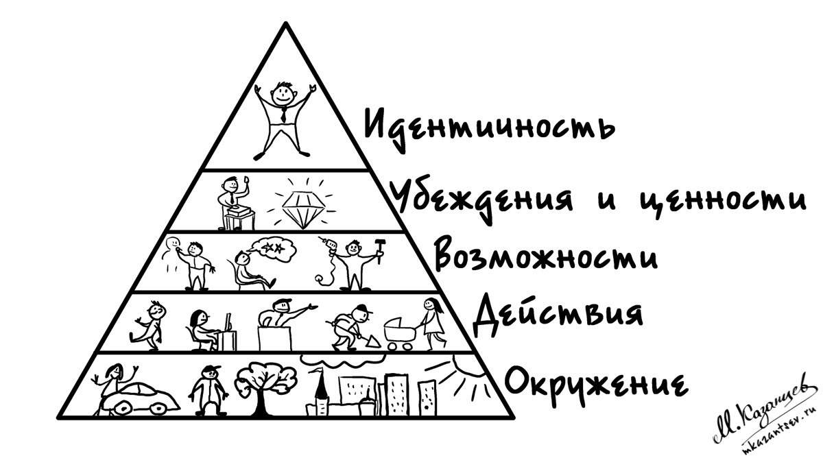 Для понимания природы этих неуда нам потребуется простой и хорошо известный инструмент: «Пирамида логических уровней». Я не шучу, инструмент действительно хорошо известен и довольно-таки прост.