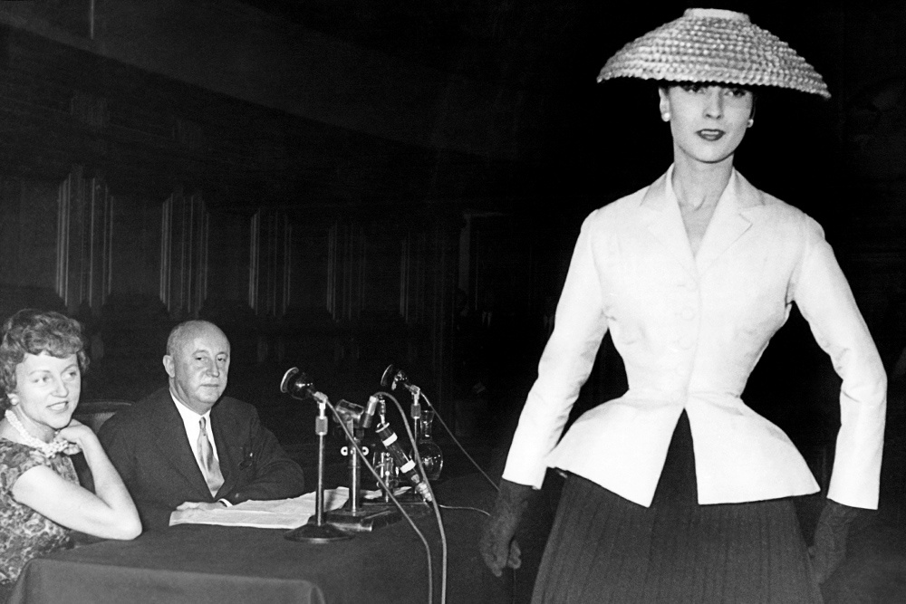 1955 год. Кристиан Диор на генеральной репетиции показа. Модель демонстрирует жакет Le Bar. Фото: Keystone-FranceGamma-Rapho via Getty Images