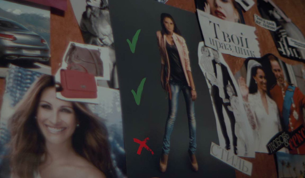 Еще одна деталь, на которой художники сделали акцент, — это фотография Виктории Бекхем на стене (известно, что Виктория является поклонницей бренда Louboutin). Создатели клипа рассказали, что на самом деле зритель видит на снимке тело исполнительницы главной роли Юлии Топольницкой с приделанной к нему головой Виктории Бекхем. И, конечно, в глаза бросается обилие проводов на дверном косяке —признак, говорящий об инфантилизме главной героини (или отсутствии в ее жизни мужчины), не способной решить свои бытовые проблемы самостоятельно и надеющейся на удачное замужество. Сильное впечатление производит и ее маман в леопардовых лосинах, которые в массовом сознании воспринимаются как символ безвкусицы.