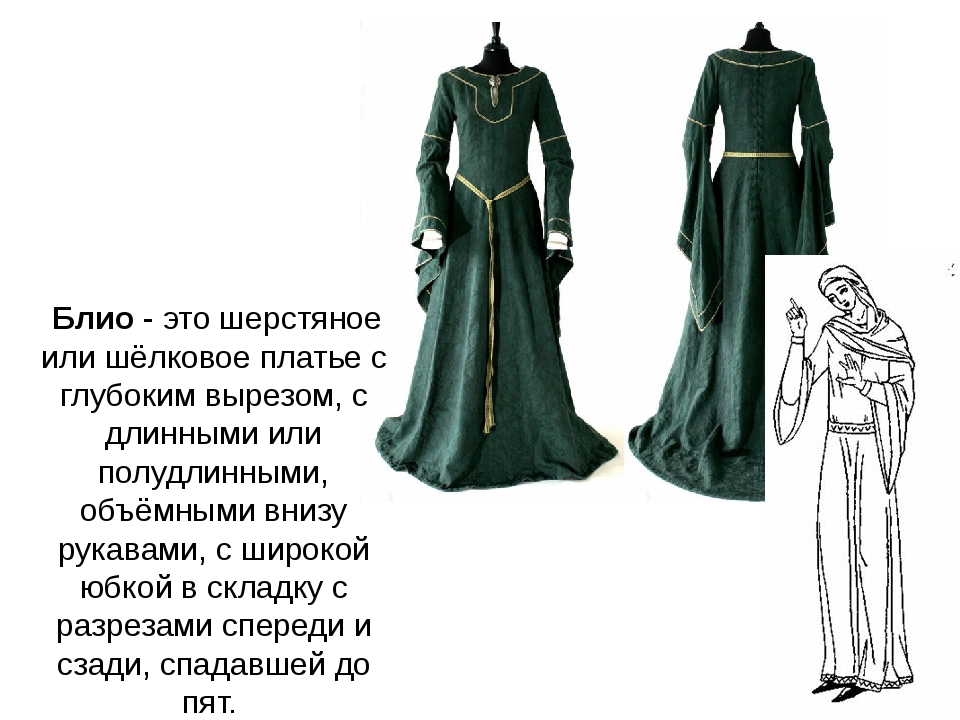 Появилась еще одна накидка с заниженной отрезной линией талии — блио, — которая надевалась через голову. Ее шили из шелка или шерсти.