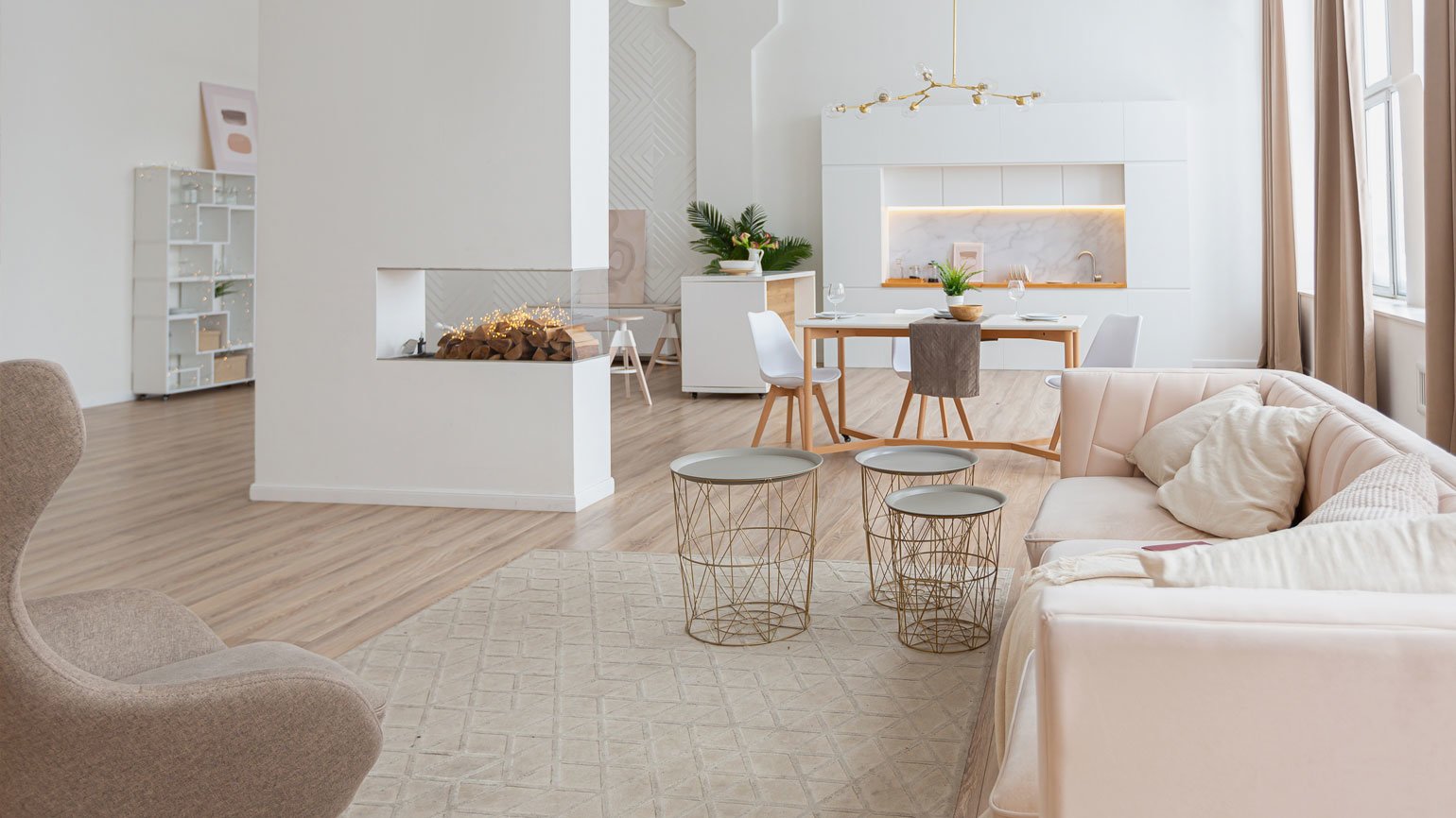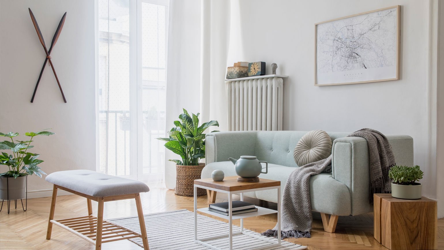 Ключевые элементы. В таком интерьере преобладают светлые тона ― белый, серый, голубой, беж ― в сочетании с оттенками дерева. Может использоваться яркий текстиль — например, пледы с цветным орнаментом, салфетки, полотенца. Мебель простых форм ― мягкая или из дерева.