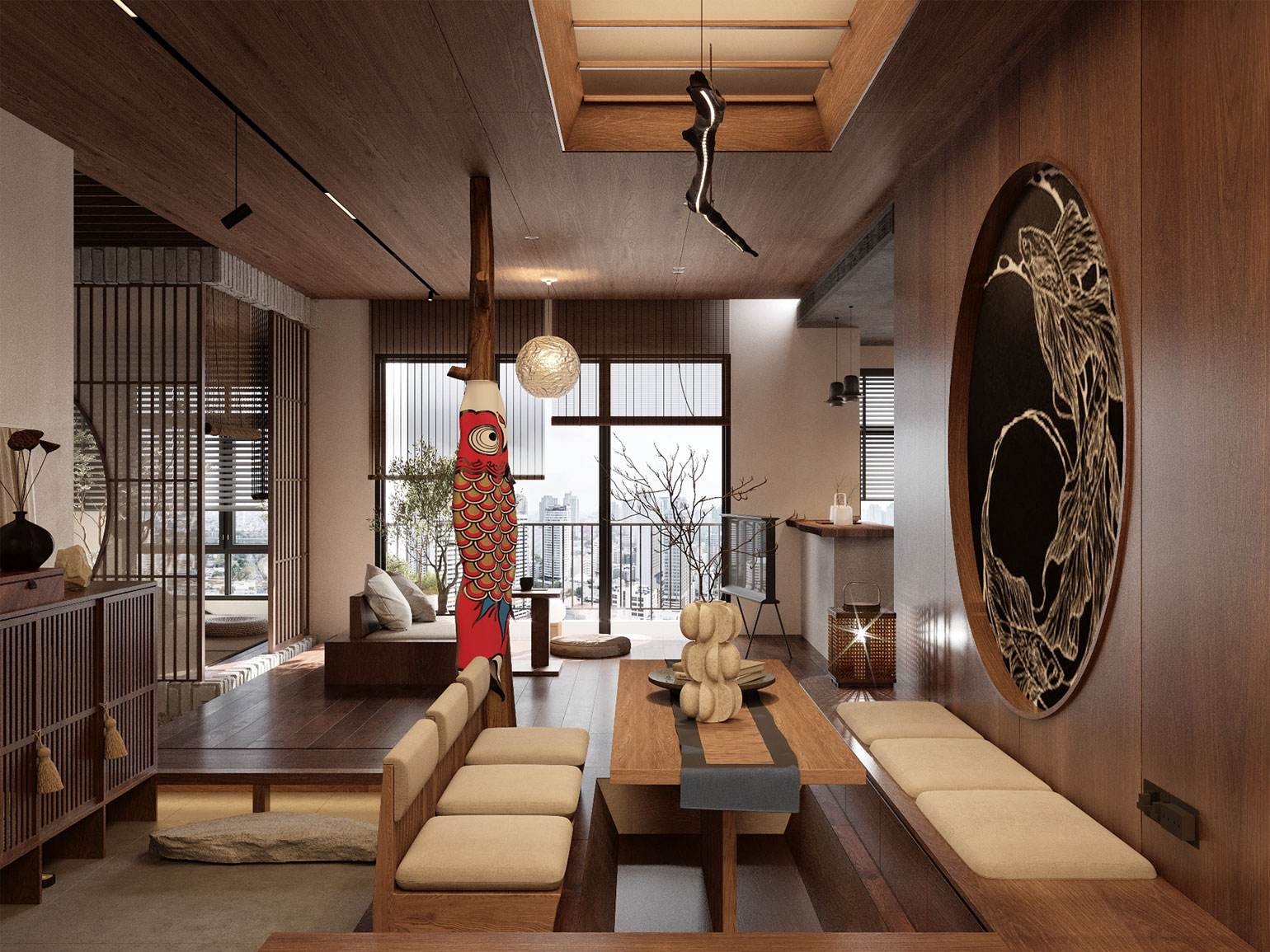 Ключевые элементы. Пространство оформляют в сдержанных природных оттенках ― бежевого, коричневого, зелёного, терракотового, иногда их разбавляют чёрными или красными акцентами. Стены покрывают обоями, драпируют тканью или, отдавая дань традициям, оформляют деревянными рамами, панелями, рисовой бумагой. Материалы также преобладают природные: дерево, камень, натуральная ткань, глина, бамбук.