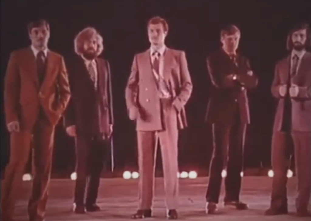 Кадр из советского видеоролика о рекламе мужских пиджаков.