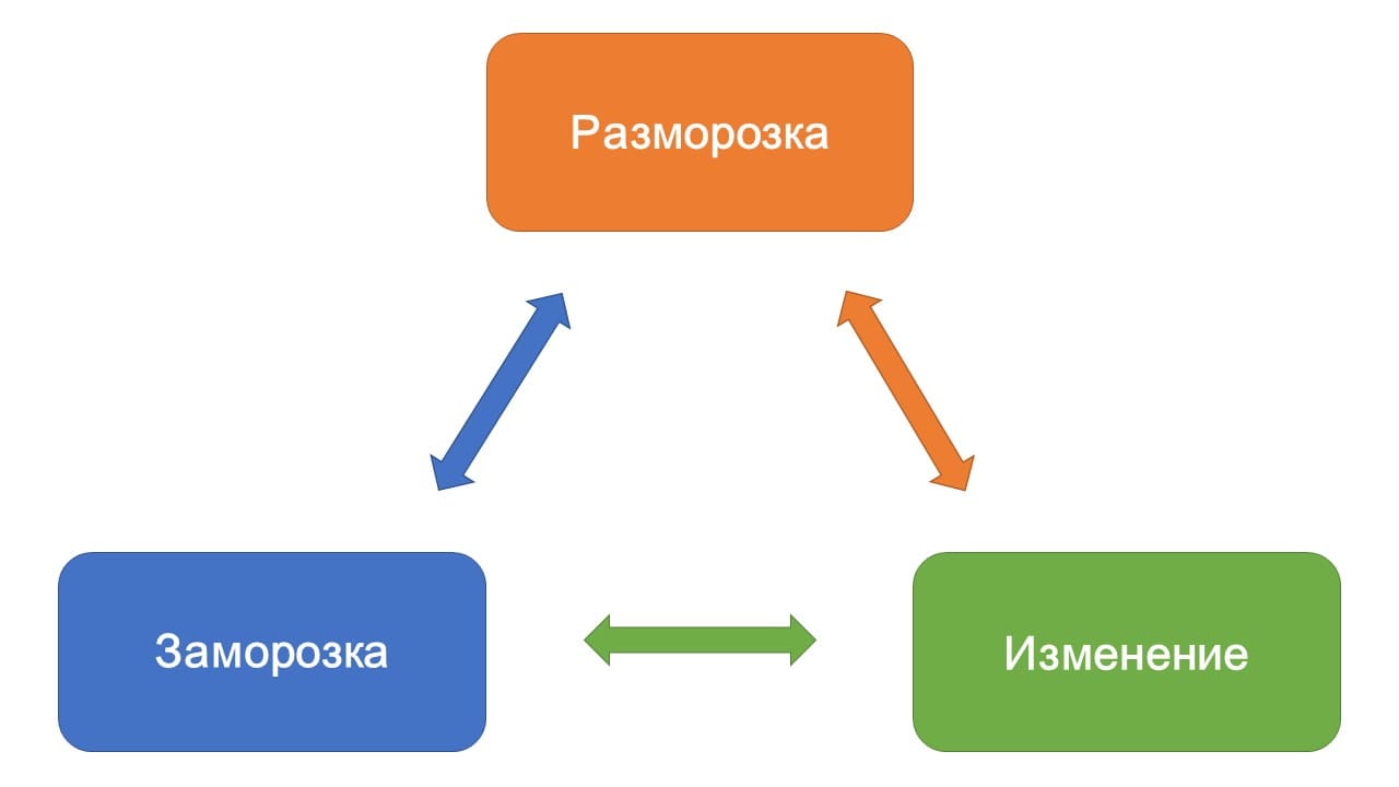 Левин определил любое изменение в человеческой системе как «изменение в три этапа»: 1. Разморозить, 2. Изменить и 3. Заморозить.
