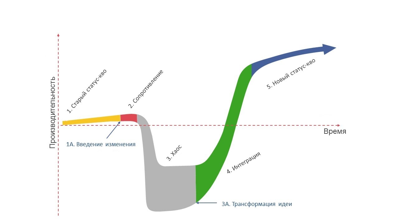 - Новый статус-кво. Наконец, процесс интеграции и принятия изменения заканчивается и становится неотъемлемой частью в работе компании. Менеджмент занят работой над повышением эффективности работы в новых условиях.