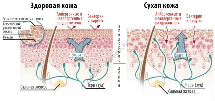 Физиологически сухая кожа — классический симптом при тяжелых дерматологических заболеваниях – псориазе или атопическом дерматите. Другие причины сухости кожи:
