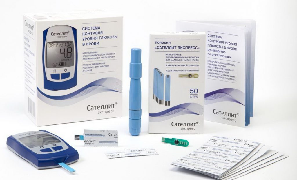 В комплект «Сателлит Экспресс», по словам Юрия Глухова, входит сам прибор с элементом питания, контрольная полоска, которая позволяет пользователю самостоятельно провести диагностику глюкометра, чтобы убедиться в его исправности, футляр, тест-полоски (25 шт) с кодовой полоской, ручка-прокалыватель, одноразовые скарификторы (25 шт), инструкция.