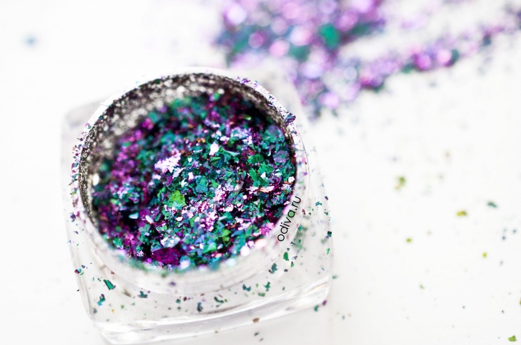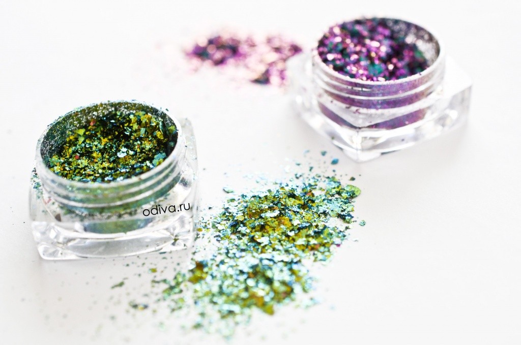 Конечно, можно использовать этот фрикцион и как обычный пигмент, но очарование необычного и загадочного маникюра будет безнадежно утрачено. Покупая хлопья для ногтей от известного бренда или более надежного реализатора, они продаются в маленьких баночках по 2 — 2,5 грамма, но каждая «снежинка» продается достаточно долго, чтобы быть действительно невесомой и тонкой, как паутина. В одной баночке обычно красиво спрессованы хлопья трех комбинированных оттенков для получения эффекта радуги.