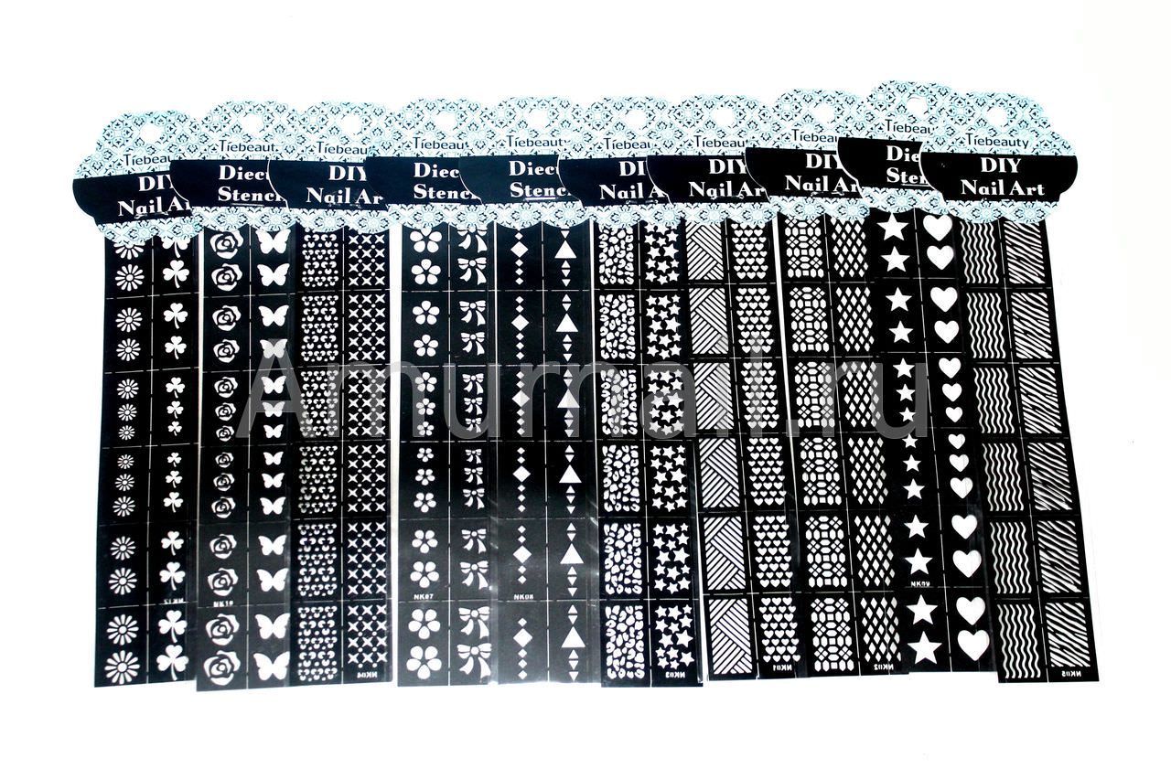 Однотонное покрытие быстро надоедает, а на нанесение рисунка не всегда есть время. Поэтому и были разработаны специальные трафареты, с помощью которых можно создать одинаковые, равномерные мотивы. Неудобство обычных трафаретов заключается в том, что держать его ровно, и при этом наносить покрытие, достаточно проблематично. Поэтому современные трафареты имеют клеевую основу, что позволяет фиксировать их на ногте в удобном положении, а затем наносить лак.