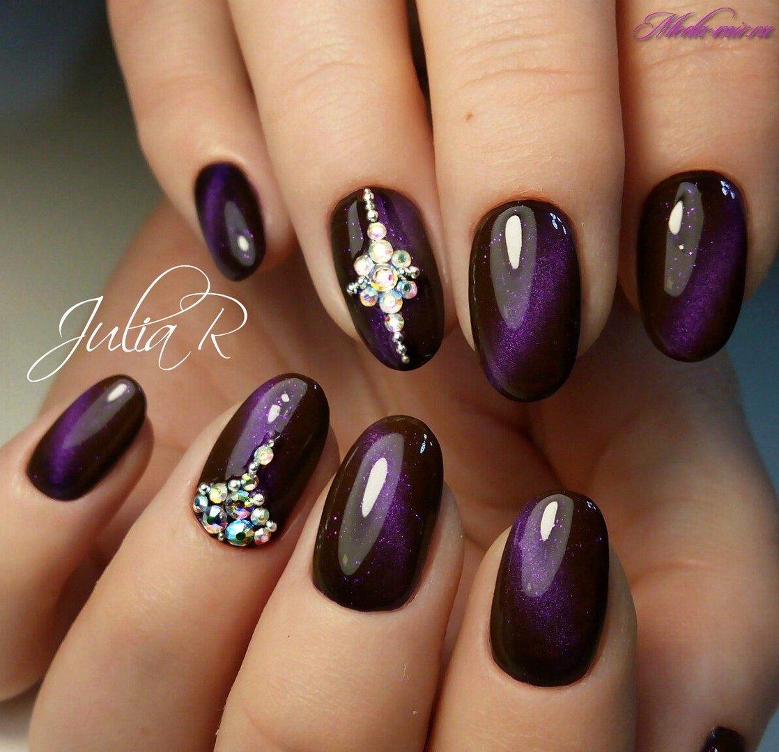 Стразы в маникюре «кошачий глаз» каждый использует по своему усмотрению. Ими можно оформить всю ногтевую пластину, украсить ими прикорневую лунку или уголок ногтя.