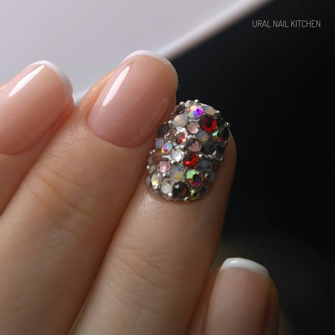 Здесь нужно быть особенно осторожным, чтобы не перегрузить не только дизайн, но и саму пластину. Велик риск нанести травму ногтю в том случае, если стразы зацепятся за ткань, колготки или волосы. Рекомендуем выбирать стразы небольшого размера и делать маникюр в стиле минимализм. Или выделить активным декором всего один пальчик, тщательно закрепите его, чтобы не остаться с некрасивыми «обломками» декора уже через пару дней.