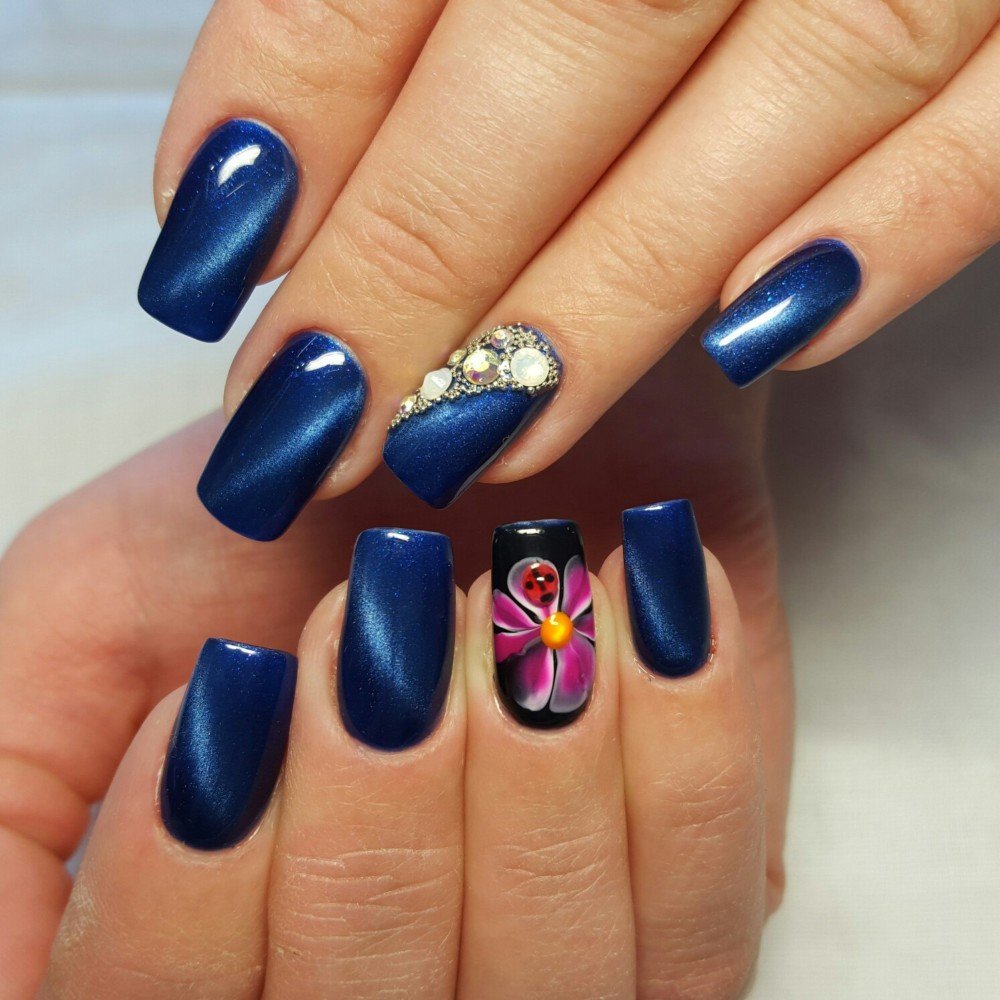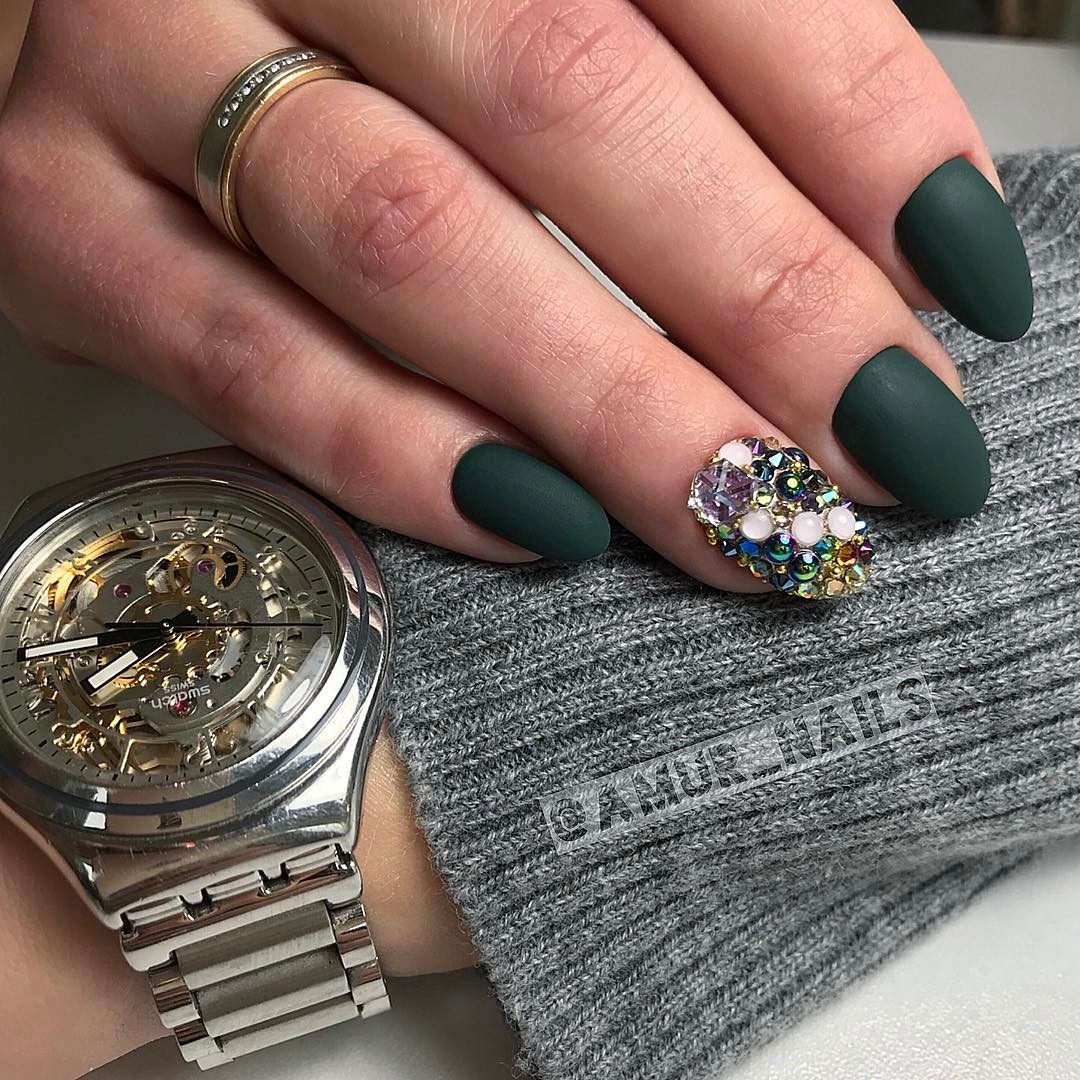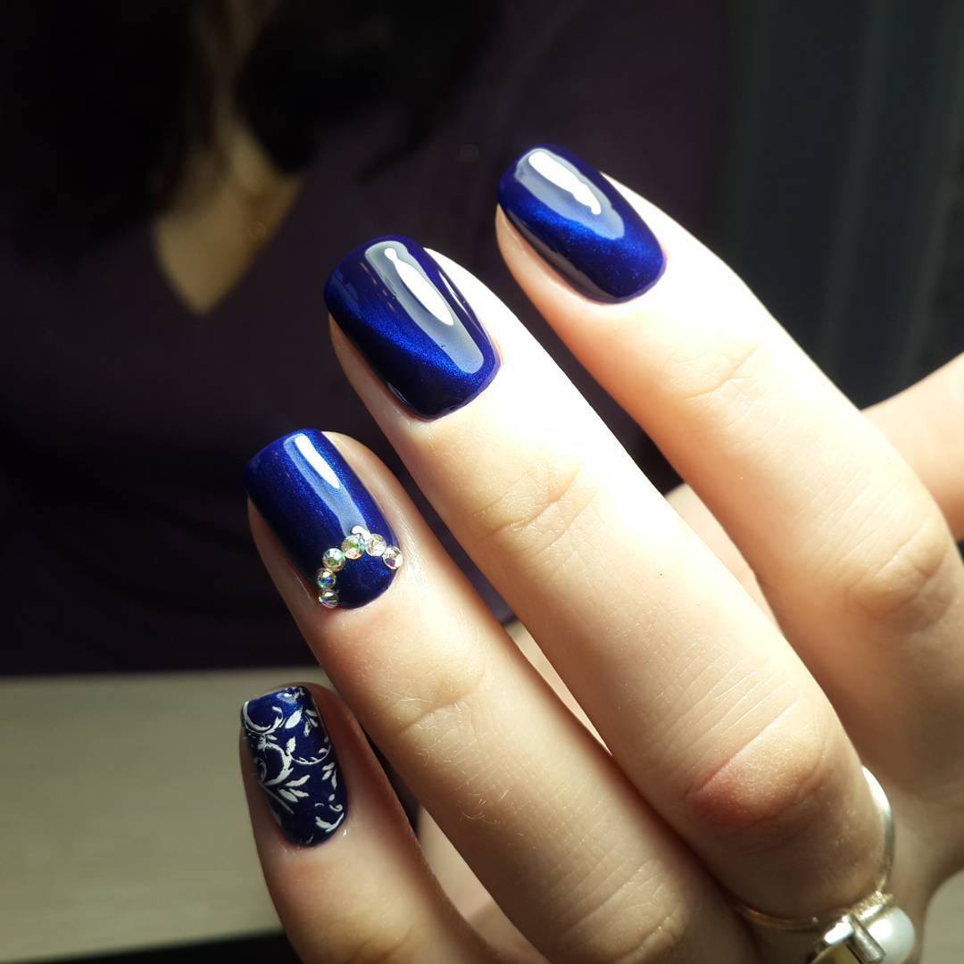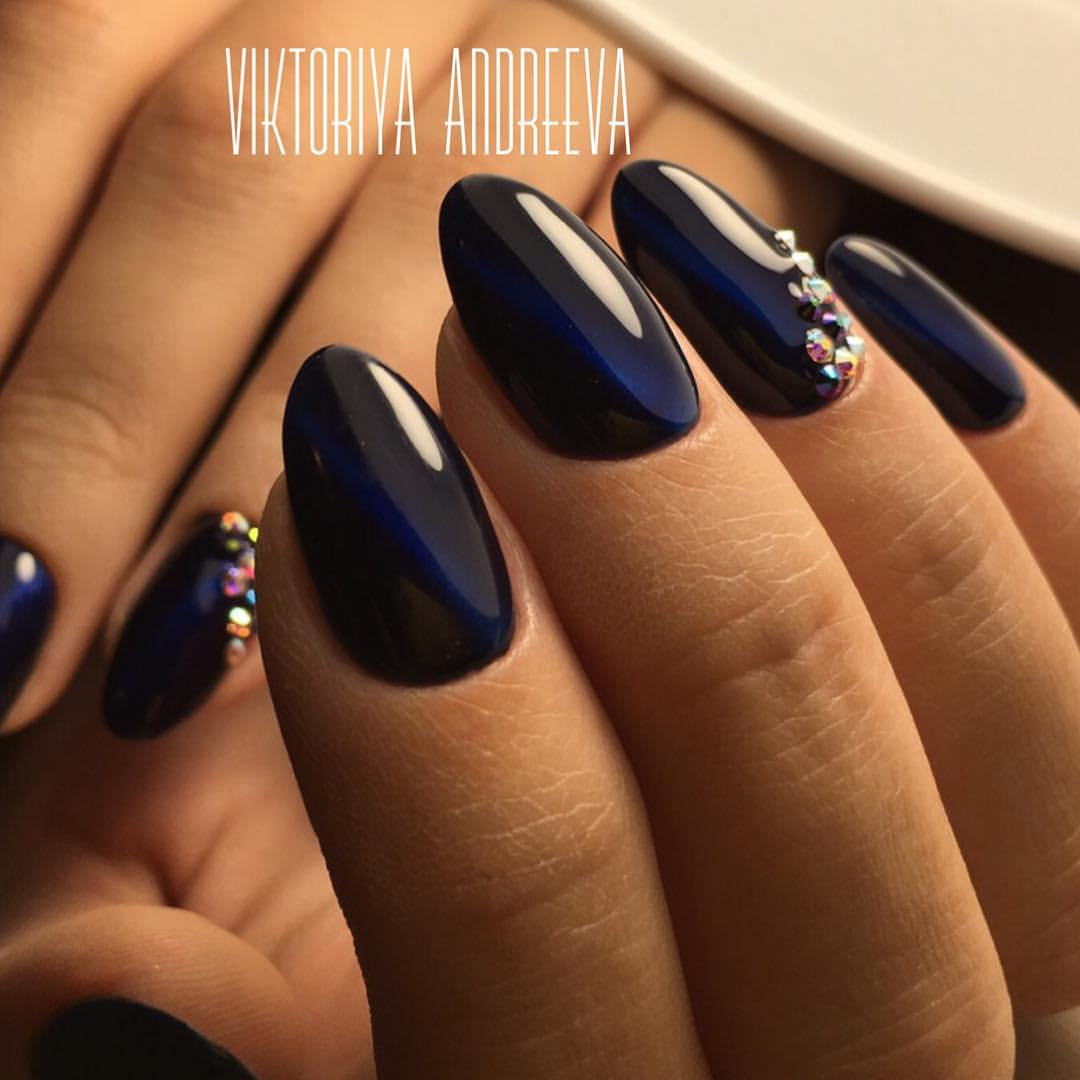 Помпезный и шикарный вид темным оттенкам лака придает декорирование ногтевых пластин блестящими стразами. Эффектно смотрятся камни на красном, бордовом, вишневом, синем, черном, зеленом, шоколадном фоне ногтевого покрытия.