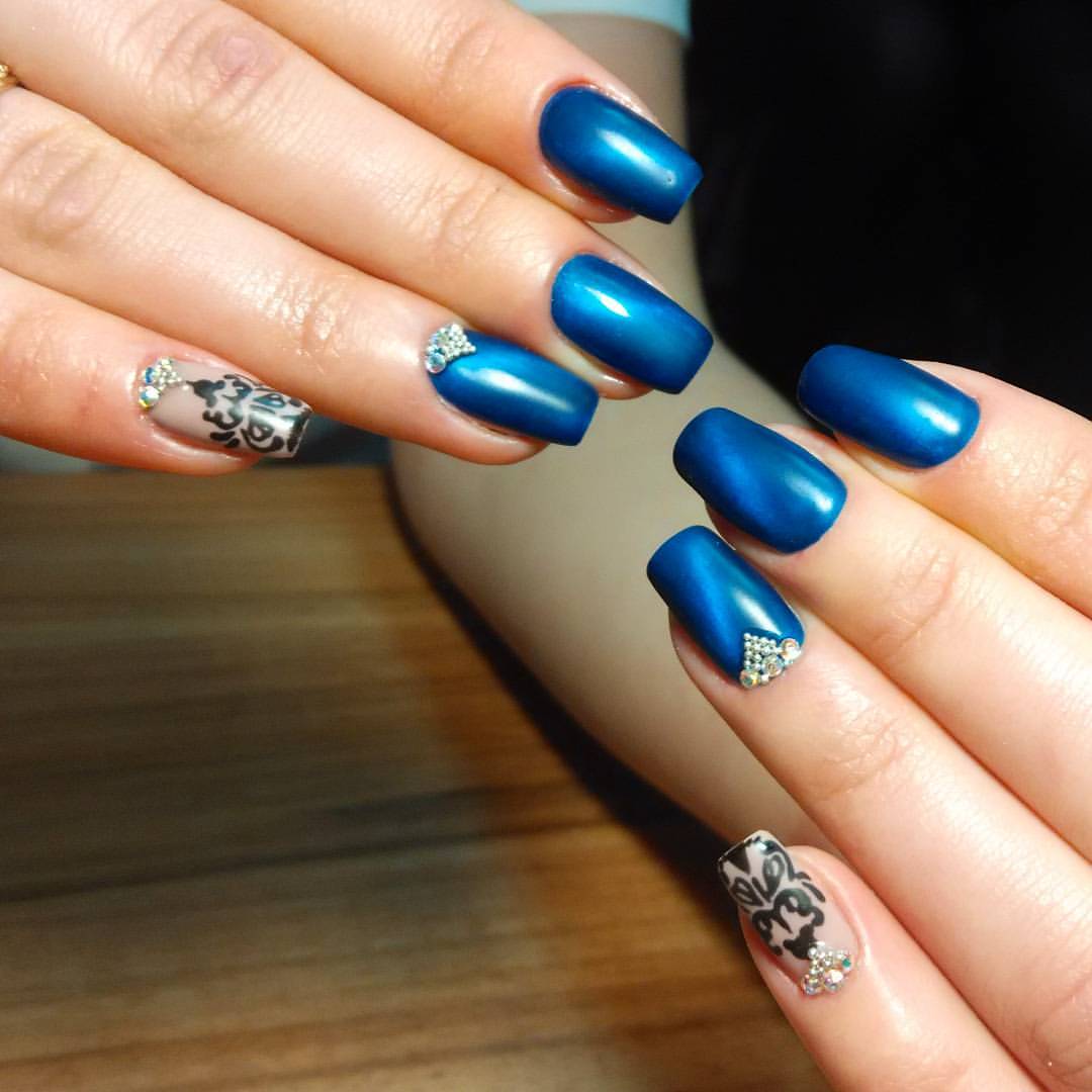 Шикарно выглядит инкрустация камнями матовых покрытий. Для спокойных, светлых, постельных цветов лака больше гармонирует блестящий декор.