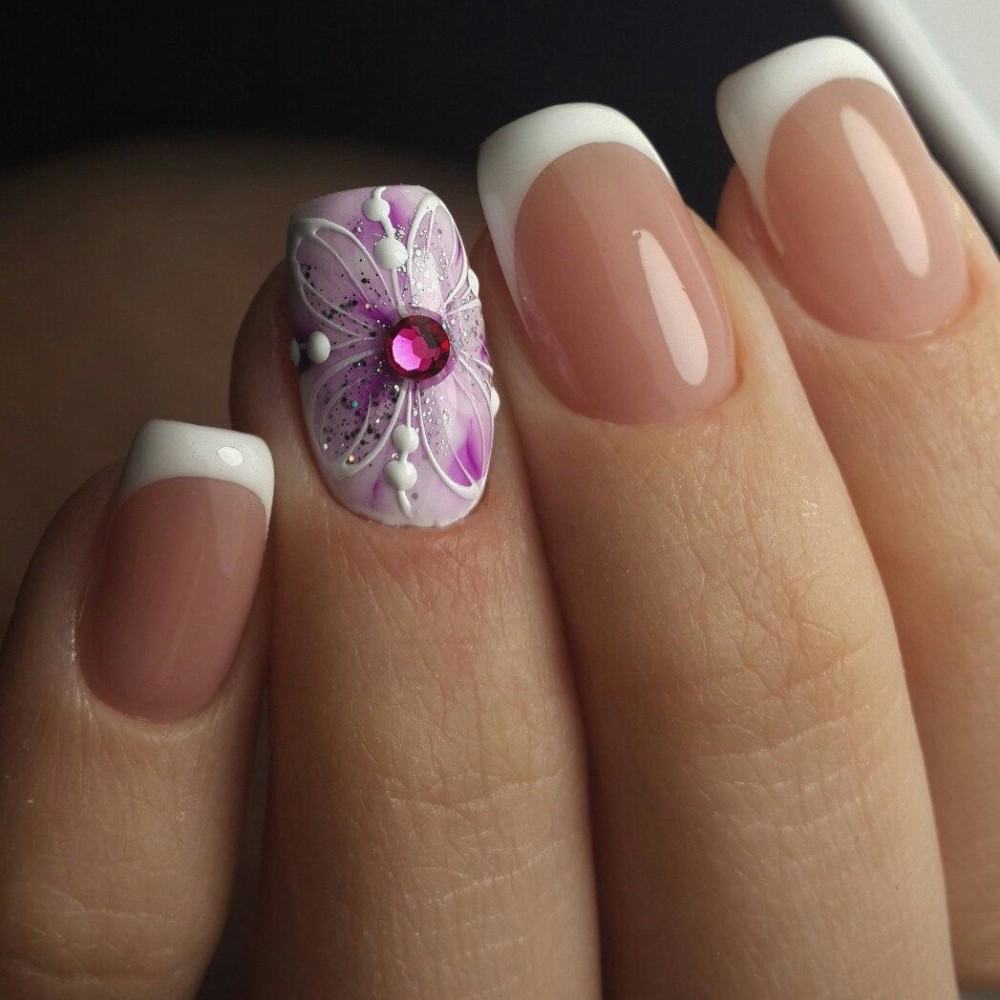 Обратите внимание: чтобы френч выглядел действительно элегантно, не стоит перегружать его избытком декора. Изысканно будет смотреться страза у основания ногтя или на вершине угла в технике «треугольная улыбка»