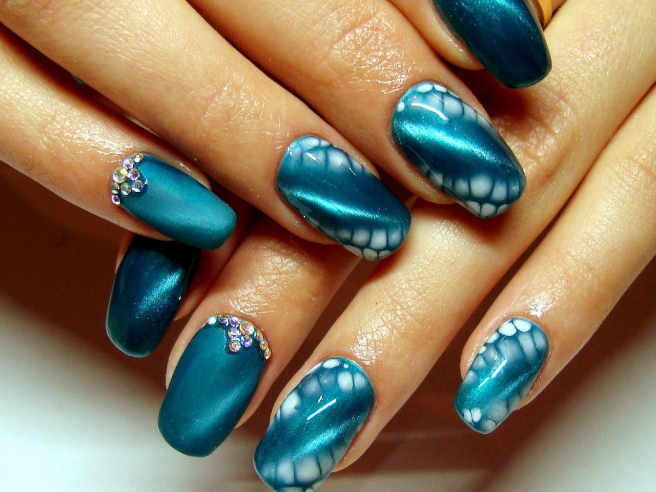 Современные узоры акцентируют внимание на руках даже без использования яркого лака. Кристаллы можно наклеить на прозрачную подложку