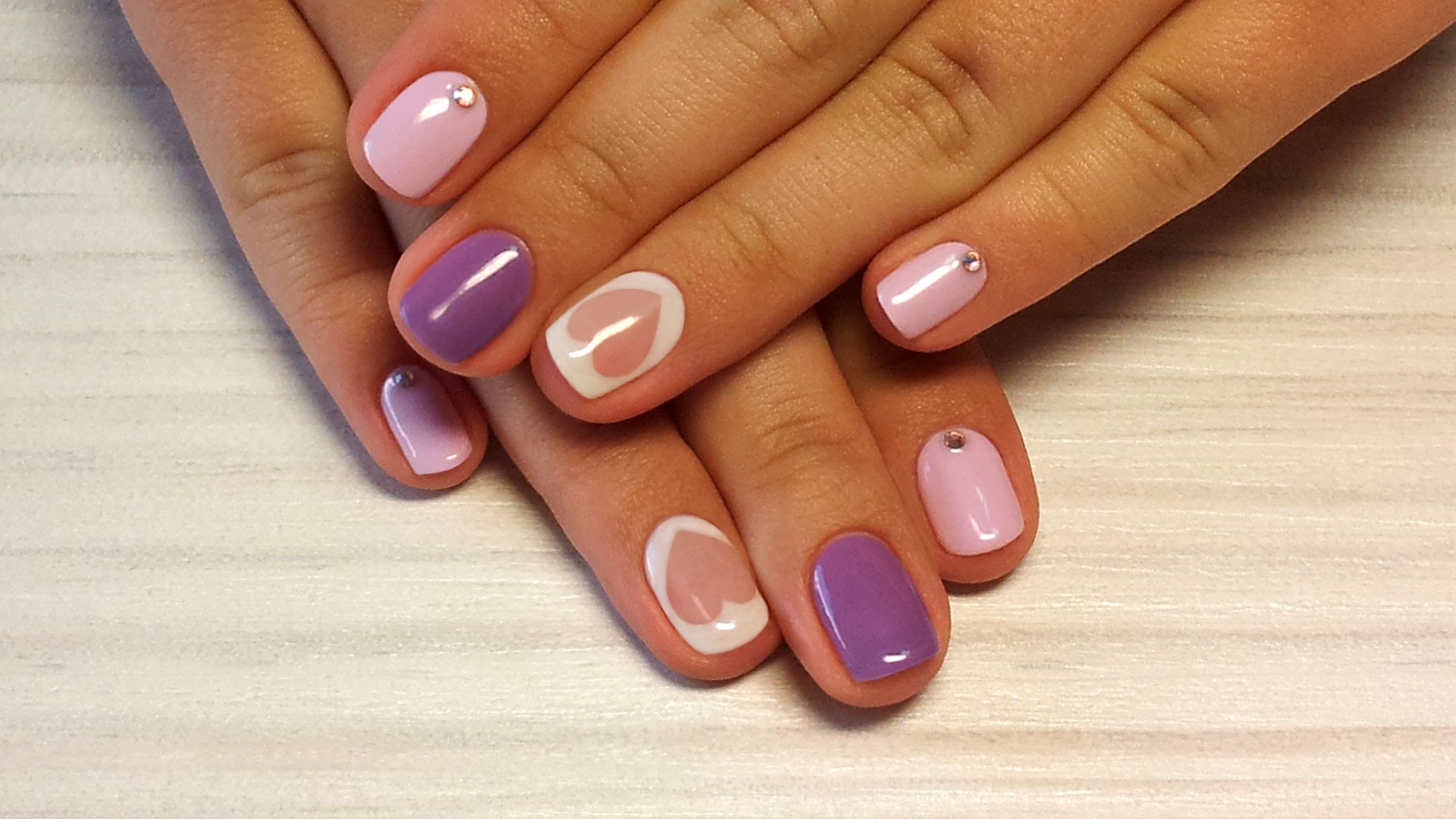 А вот еще интересный вариант школьного маникюра, он немного напоминает первый, но гораздо проще в исполнении. В этом примере он сделан в фиолетовых тонах, но можно и в другом любимом вами цвете.