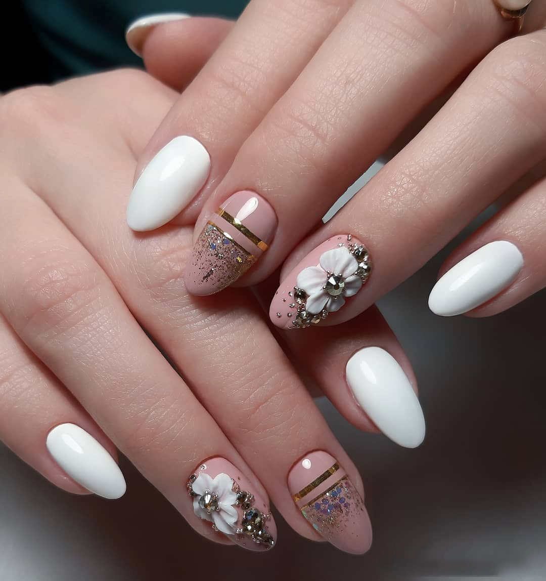 Длинным он добавляет насыщенность цвету, тем самым выгодно подчеркивая их длину, привлекая внимание к форме. Вместе с классикой белых жемчужных цветов используются фисташковые, голубые, нежно-сиреневые