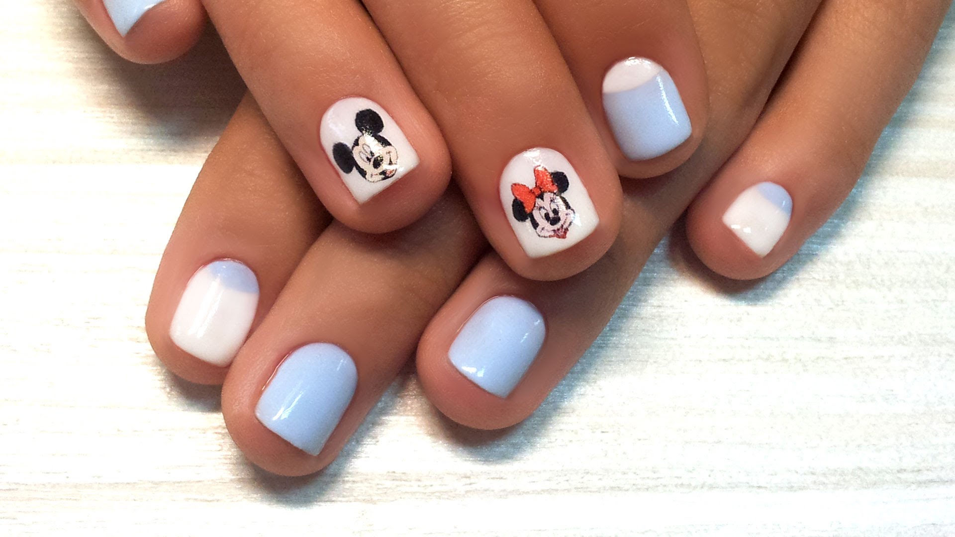 - простой маникюр в школу с небольшими рисунками или наклейками — ушки минни-маус, кошка;