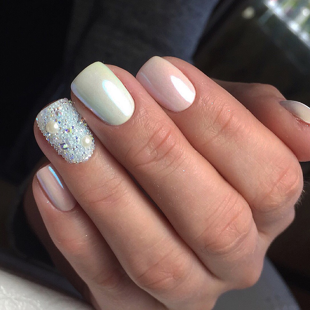 Самая нежная втирка для ногтей — жемчужная. Ее часто выбирают невесты для свадебного маникюра. Также она идеально сочетается с французским маникюром или дизайном «лунки». Жемчужную втирку обычно наносят на светлый гель-лак: розовый, белый, молочный, персиковый, ледяная роза, пыльная сирень и другие пастельные оттенки. Это идеальная идея дизайна для праздничного маникюра, не зависимо от времени года.
